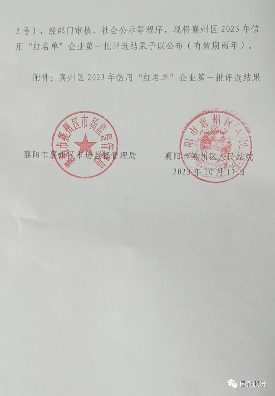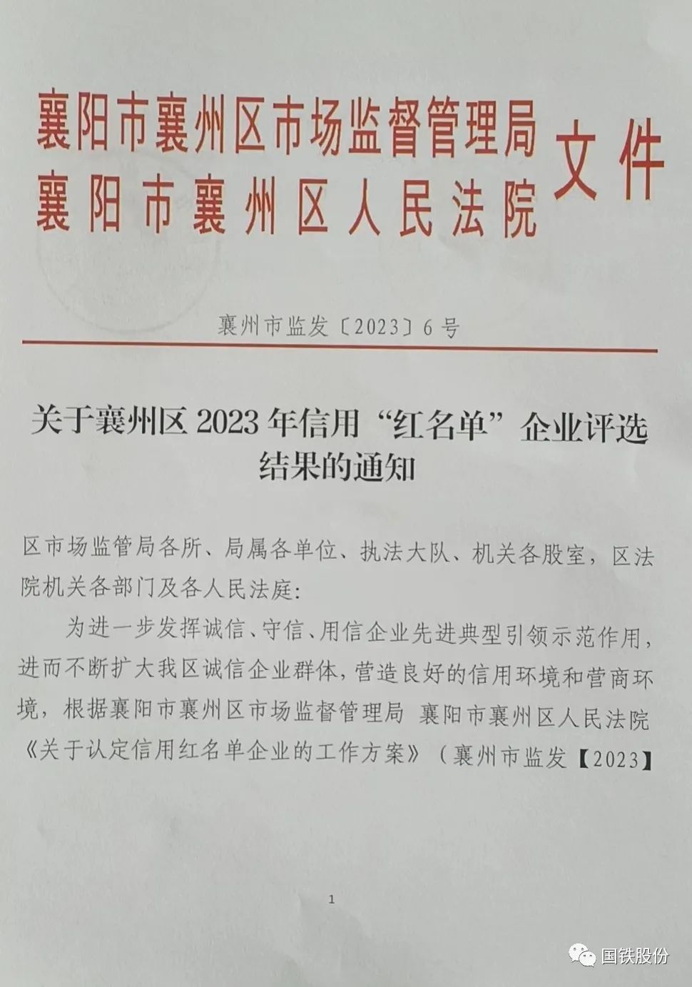 【喜報(bào)】國鐵機(jī)電獲“襄州區(qū)2023年信用‘紅名單’企業(yè)”榮譽(yù)